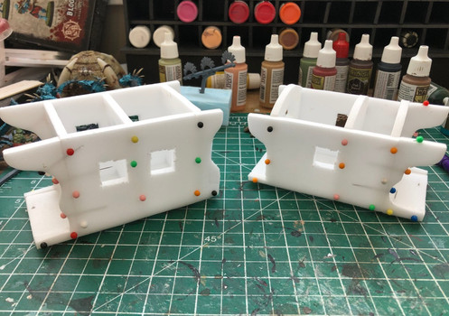 Next I attached the walls to the floor (along with the internal supports) using PVA glue, and used my trusty sewing pins to hold them all together until completely dried. You'll notice one of the vardos has decorative curves along the back where the rear door will be: both will have similar detailing, but I experimented with whether it was easier to cut it out along with the sides, or to add it on separately. In the end I realized either was worked well, and had more to do with how detailed and small you wanted the decoration to be. The more intricate a design you want, the easier it would be to add it on separately.