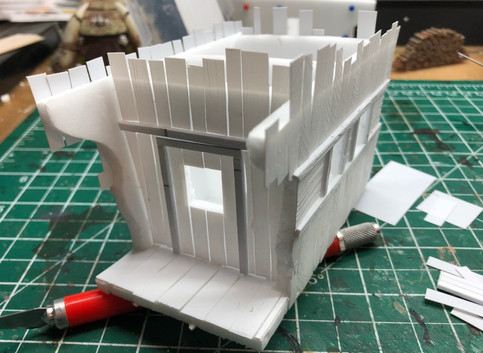 Using thin strips of styrene, I started adding the wood 'planks' along the exterior. Before adding any glue (PVA again) I played around with the strips to come up with a design I was happy with. It may be hard to see in these photos, but I textured the strips using a sharp narrow awl to give them the look of wood grain. When placing the strips together, I made sure to have strips with wood grain angled in different directions placed next to each other.
